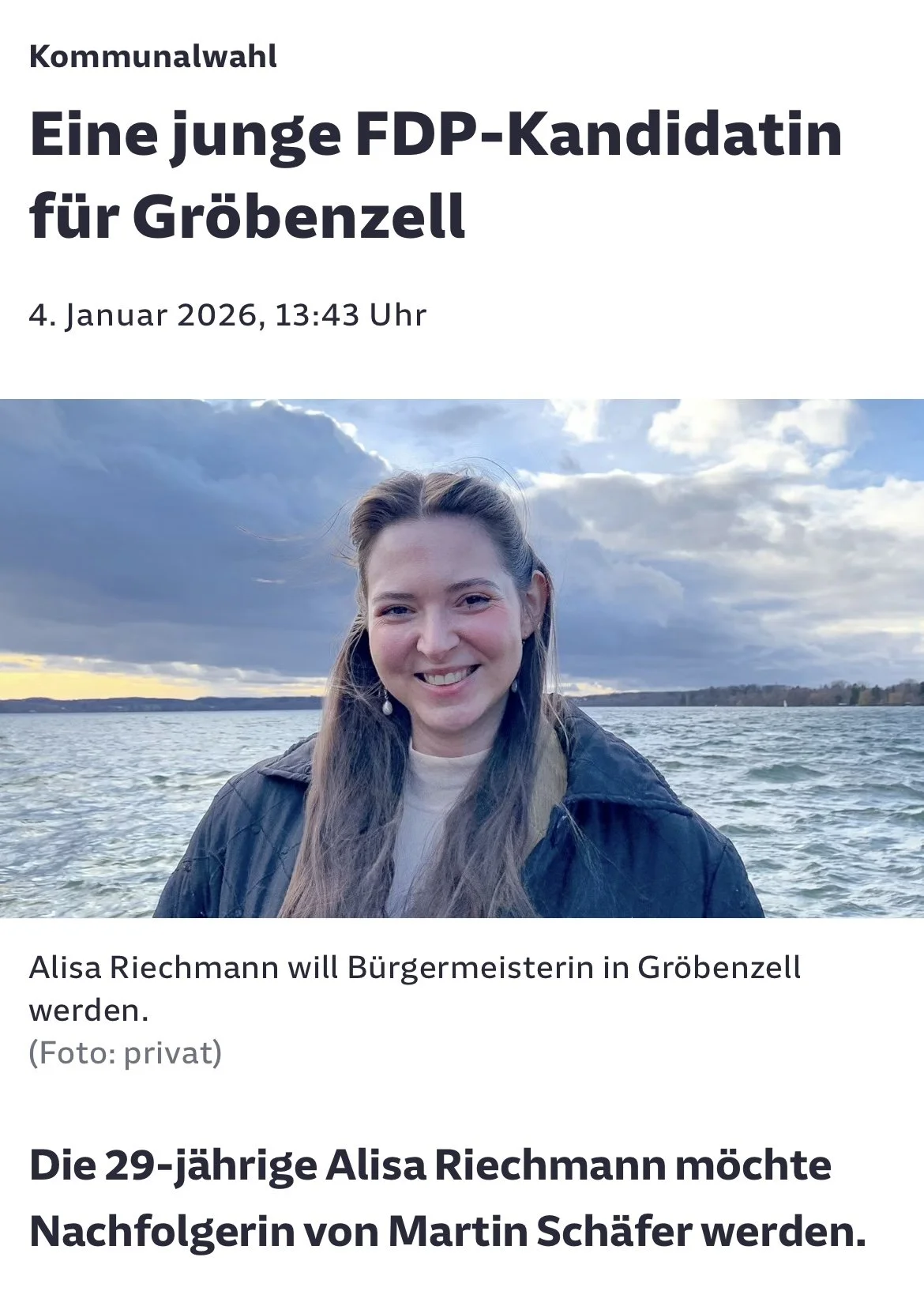 Ich kandidiere als Bürgermeisterkandidatin, weil ich Verantwortung für die Zukunft von Gröbenzell übernehmen möchte. Gröbenzell wird wachsen – entscheidend ist, dieses Wachstum so zu gestalten, dass unser Ort lebenswert, bezahlbar und zukunftsfähig bleibt. Dafür setze ich auf klare Entscheidungen, wirtschaftliche Stabilität und eine moderne, handlungsfähige Verwaltung. Politik soll für mich nicht ideologisch sein, sondern im Alltag der Menschen funktionieren – heute und morgen.